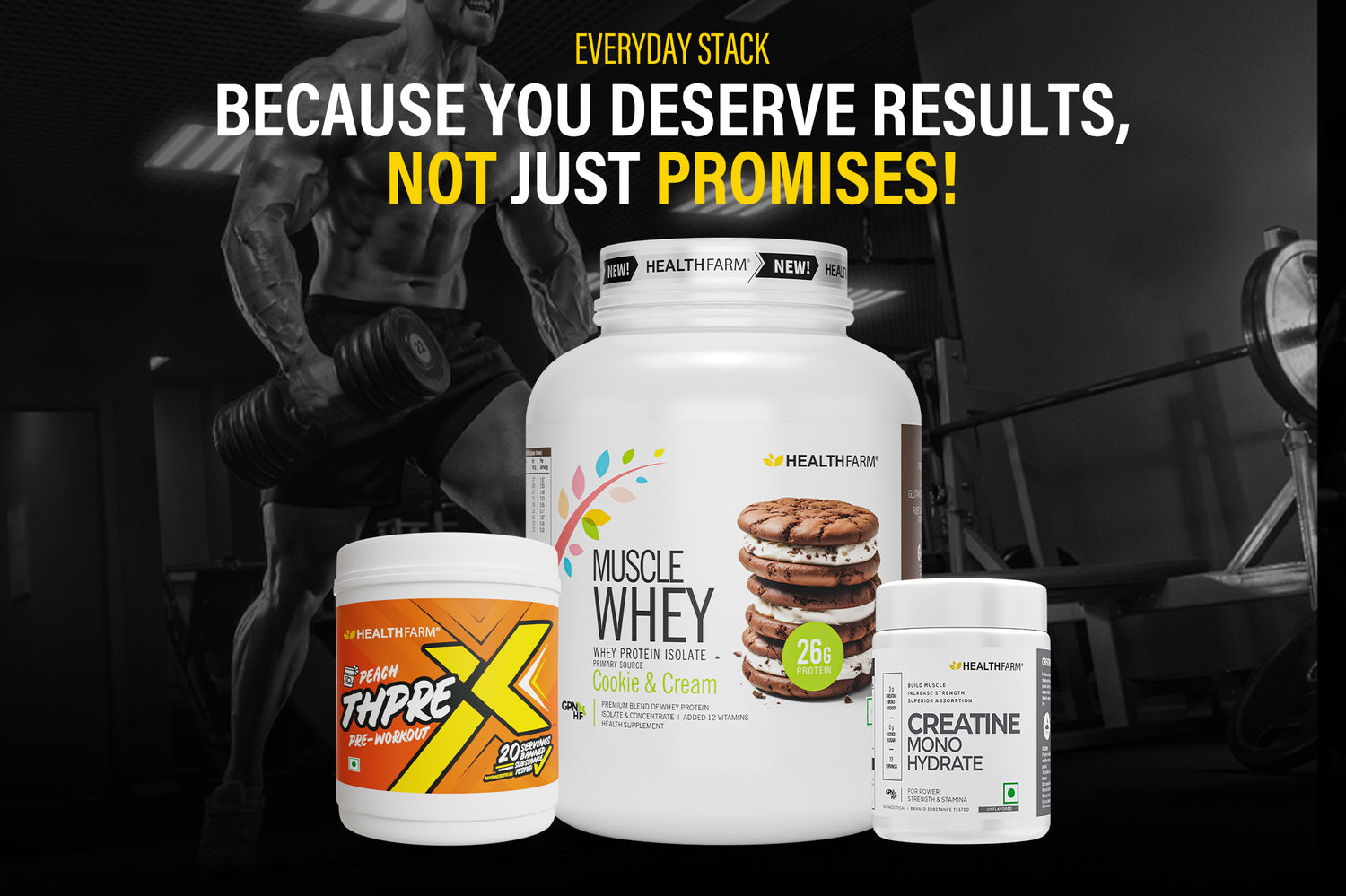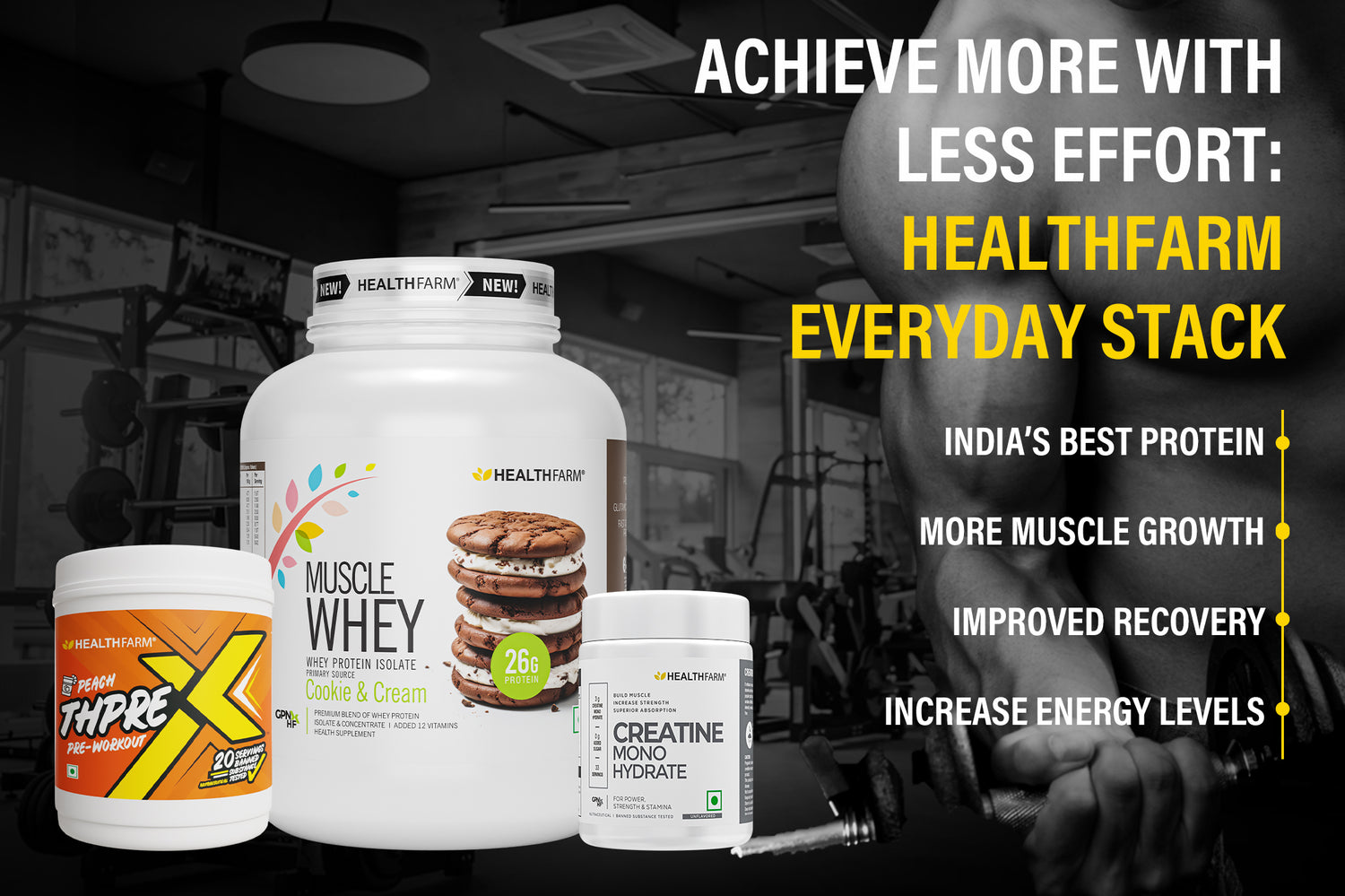 The Everyday Stack from Healthfarm combines three essential supplements to support your fitness journey. Muscle Whey provides a high-quality source of protein to fuel muscle growth and repair, helping you achieve your strength and fitness goals. Creatine Monohydrate enhances performance by increasing energy levels during intense workouts, allowing you to push harder and train longer. Lastly, Thprex Preworkout delivers a potent blend of ingredients to boost energy, focus, and endurance, ensuring you're primed for peak performance every time you hit the gym. Together, these supplements form a powerful stack to optimize your workouts and accelerate your results, making them a must-have addition to your daily fitness routine.
