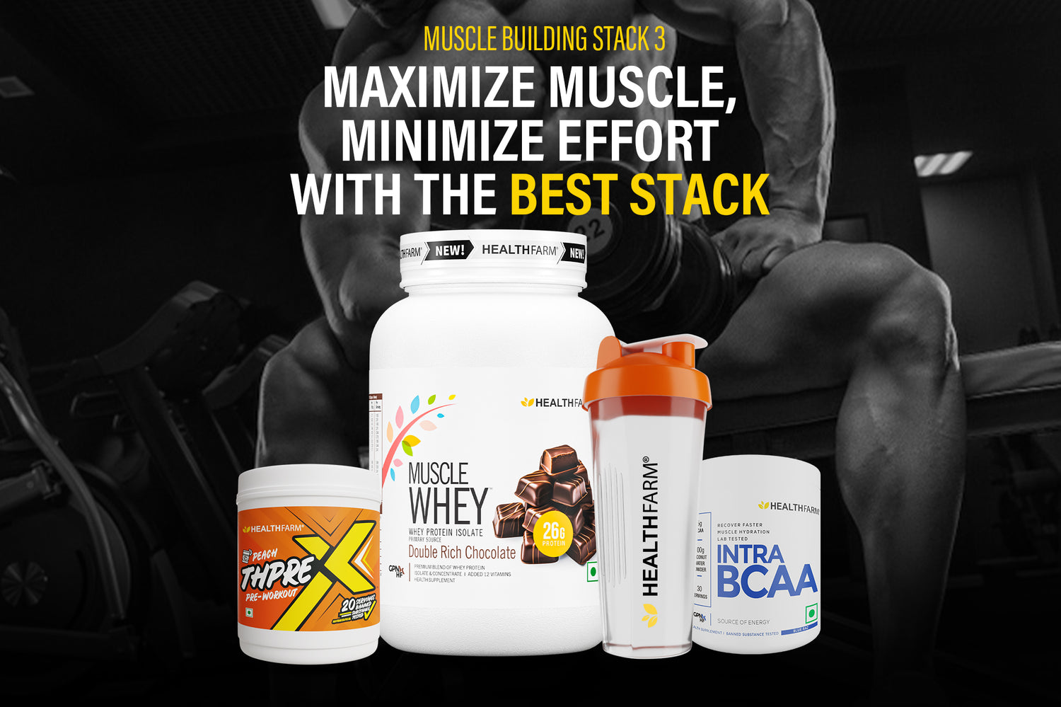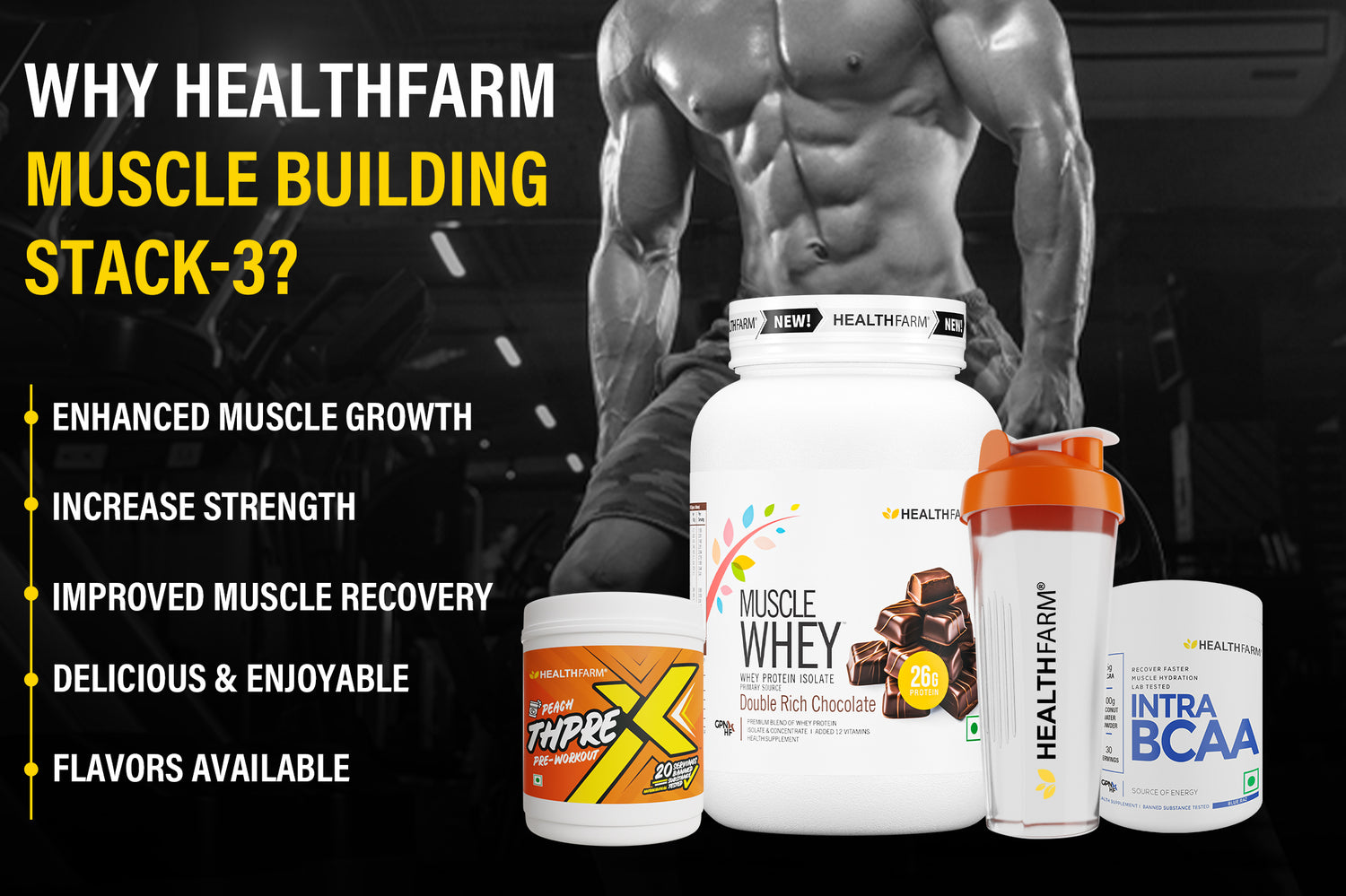 Muscle Building Stack 3 by Healthfarm is your go-to choice for enhancing muscle growth and performance. Firstly, it packs a punch with premium-grade protein in Muscle Whey, providing your muscles with essential fuel for growth and repair. Plus, our Intra BCAA formula jumpstarts muscle protein synthesis and fights fatigue during workouts. ThpreX takes things up a notch by boosting testosterone levels, leading to increased strength and muscle development. And with a handy shaker included, mixing and staying hydrated is a breeze. With Muscle Building Stack 3, you're not just getting gains, but also optimal performance, delicious flavours, and convenience all in one package.