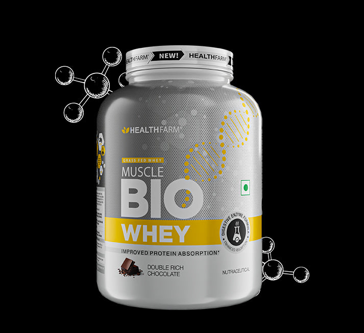 Healthfarm Muscle Bio Whey is a high-quality protein supplement made from grass-fed whey. It offers high quality protein per serving, with added digestive enzymes for fast absorption, supporting muscle growth and recovery.