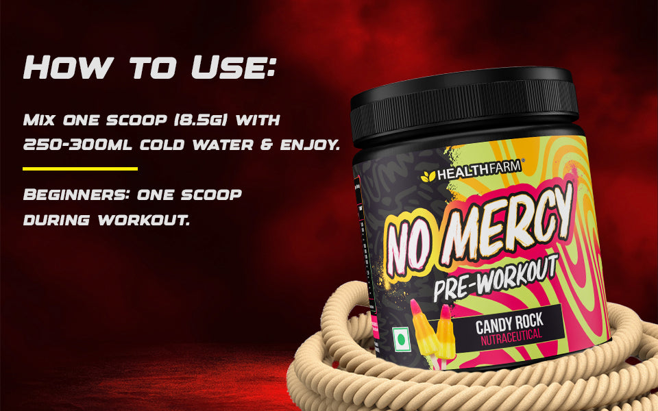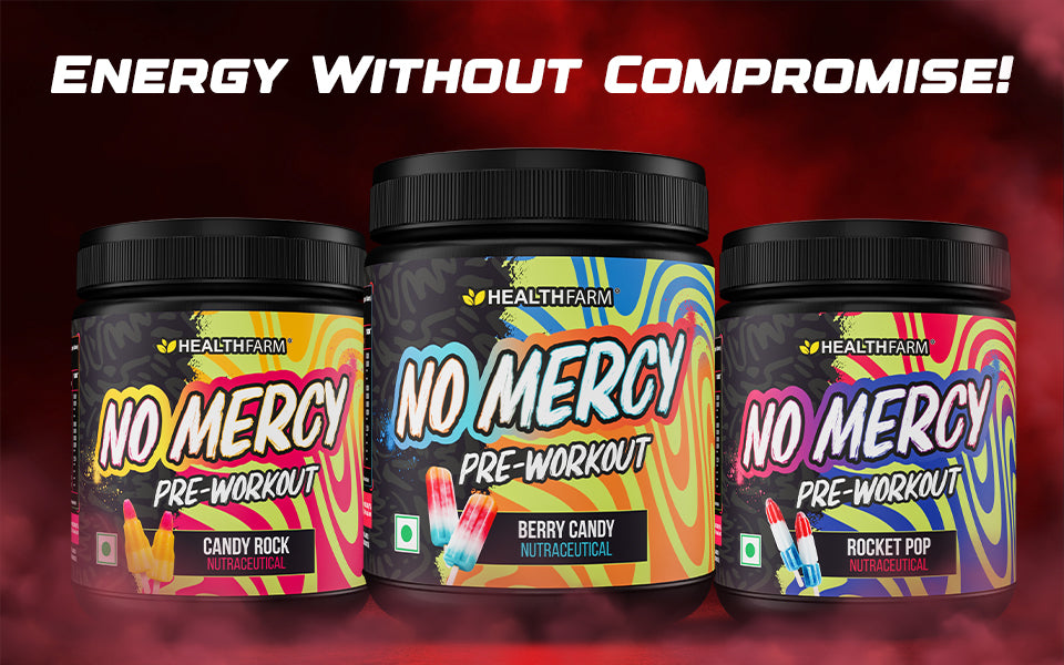 Healthfarm No Mercy Pre-Workout Supplement is your ultimate partner for peak performance in the gym. Packed with scientifically studied ingredients like Beta-Alanine, L-Citrulline, and Caffeine Anhydrous, it enhances endurance, energy, and muscle pumps. This zero-carb, zero-fat formula ensures you get maximum gains without extra calories. Enjoy three delicious flavours – Candy Rock, Berry Candy, and Rocket Pop. Simply mix one scoop with chilled water and experience increased focus, improved muscle endurance, and better hydration. Healthfarm No Mercy is designed to help you push your limits and achieve your fitness goals efficiently.